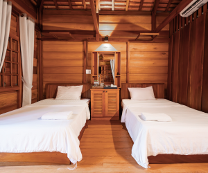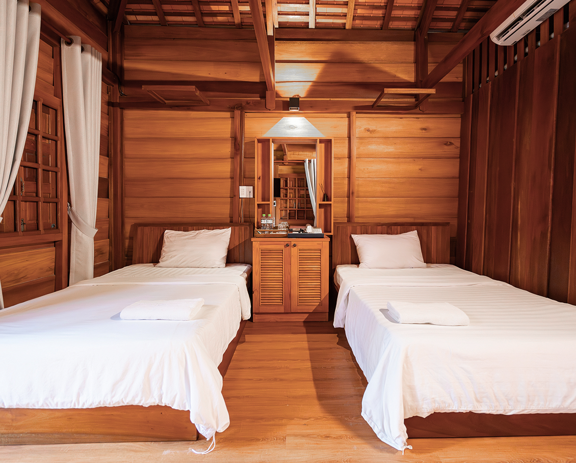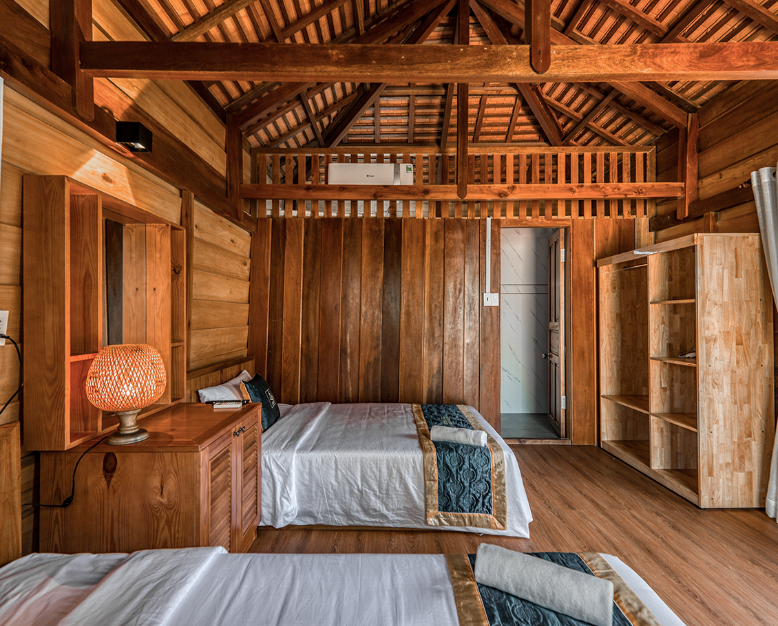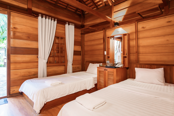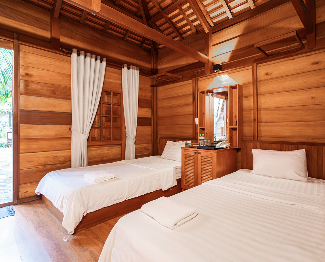 Phòng Deluxe là lựa chọn lý tưởng cho những ai tìm kiếm sự riêng tư và thoải mái. Không gian rộng rãi với 2 giường lớn, nội thất gỗ ấm cúng, ánh sáng tự nhiên và đầy đủ tiện nghi – thích hợp cho kỳ nghỉ thư giãn cùng người thân hoặc bạn đồng hành.