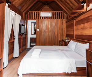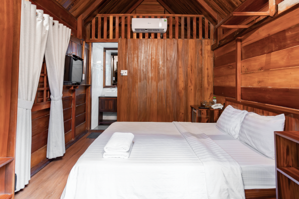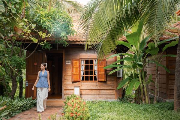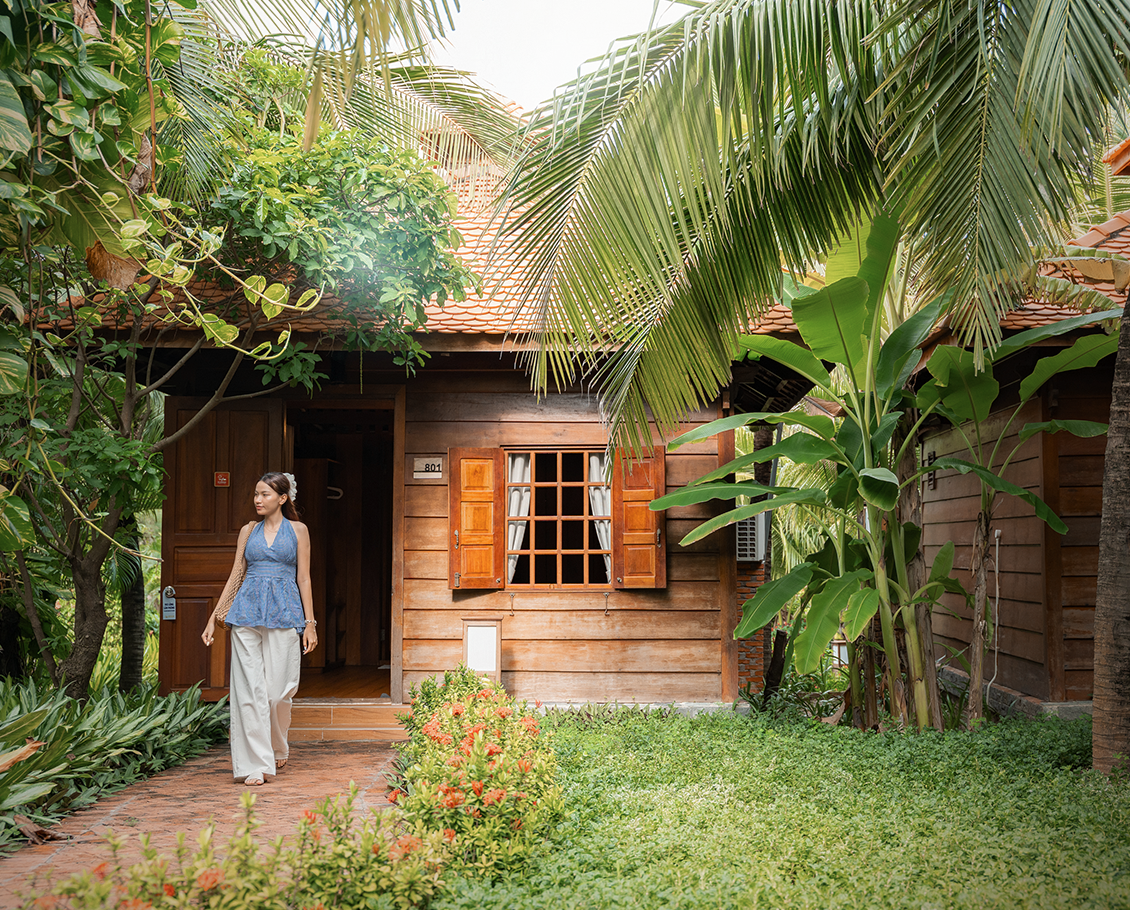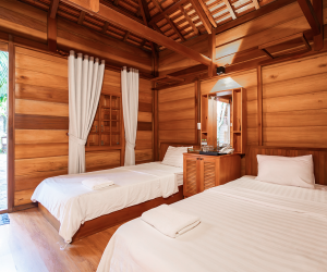 Phòng gỗ hướng biển – nơi mỗi sớm mai là tiếng sóng vỗ dịu êm bên hiên nhà gỗ mộc mạc. Chỉ vài bước chân trên cát vàng mịn là bạn đã chạm đến biển xanh mênh mang trước mắt.